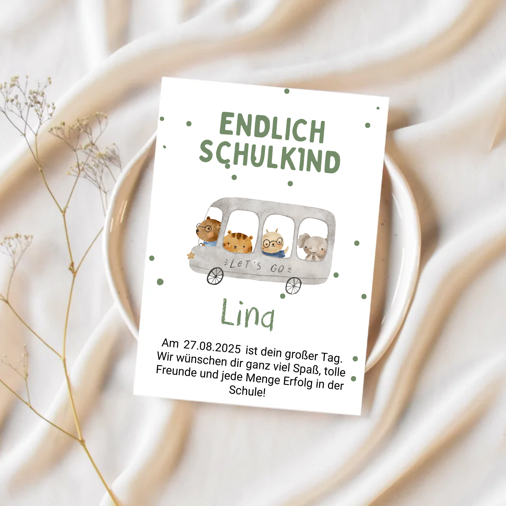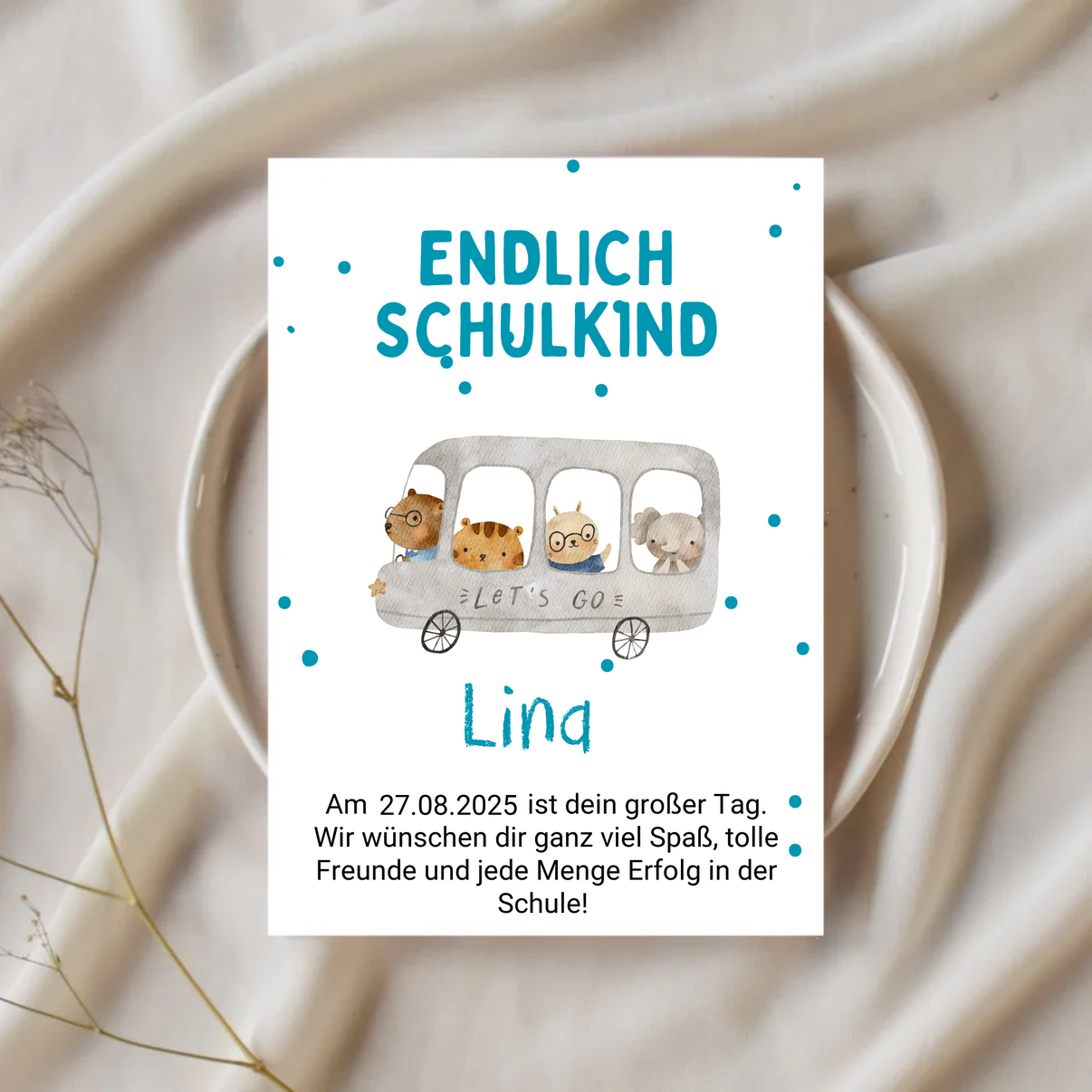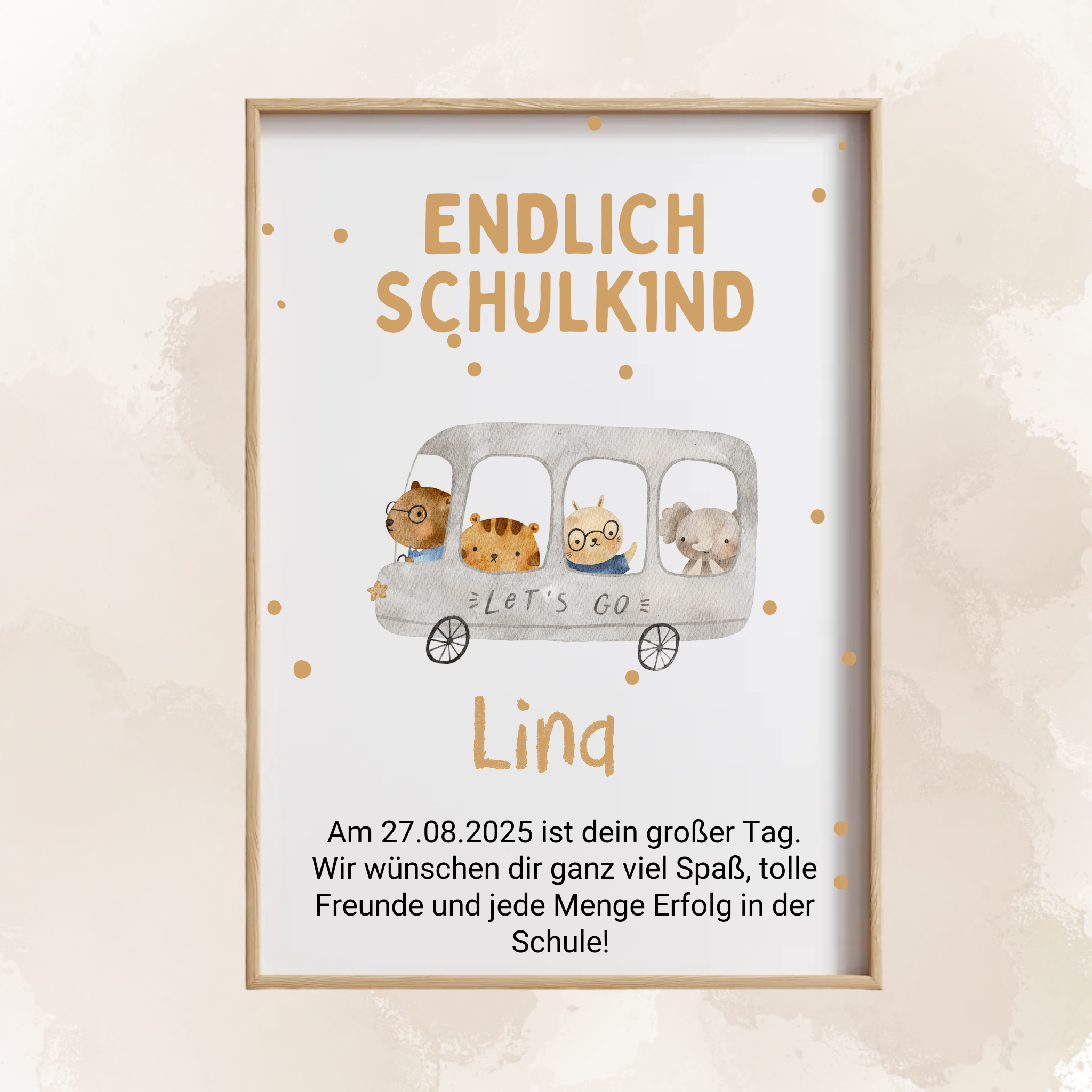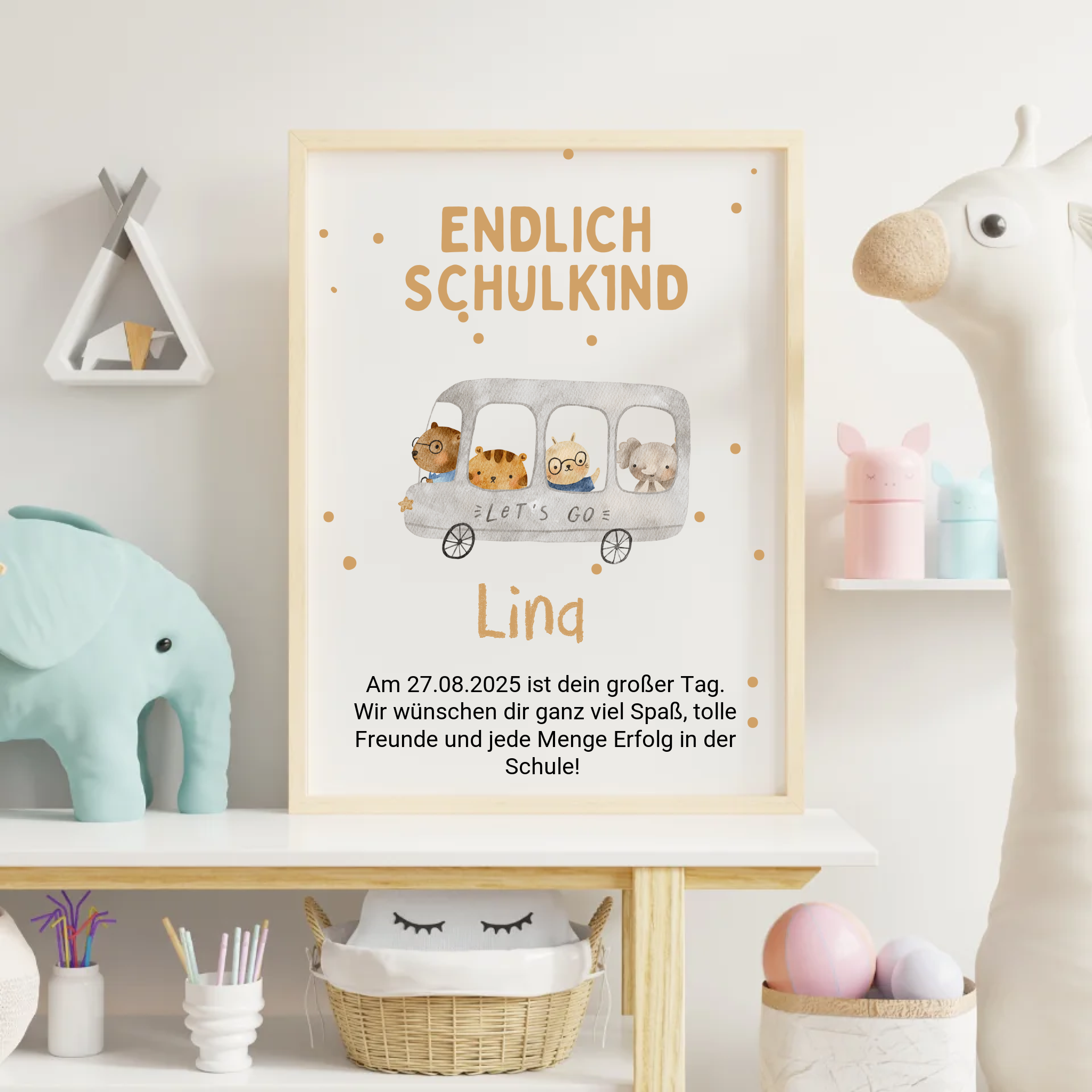 Die moderne Illustration kombiniert dezent gelbe Akzente mit freundlichen Tierfiguren im Bus, die symbolisch alle gemeinsam das Abenteuer „Schule“ antreten. Du kannst den Namen deines Schulkindes und das Datum des Einschulungstages direkt im Online-Editor anpassen. So entsteht ein Unikat, das perfekt zum Kind und zum großen Tag passt.