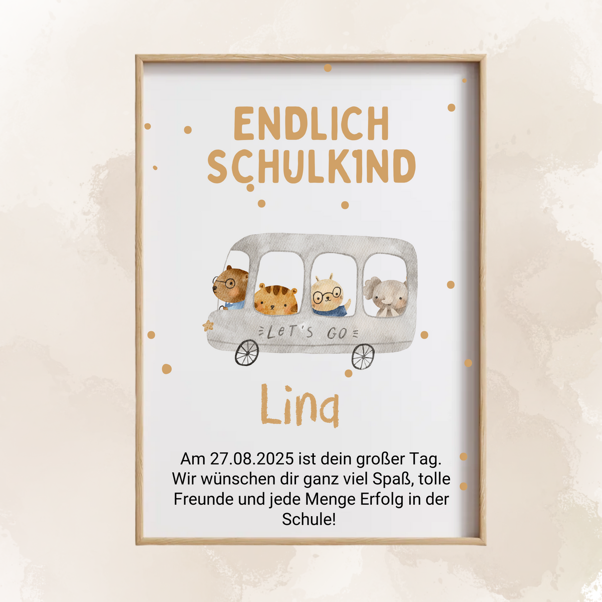 Jedes Kind freut sich über ein individuelles Andenken an den ersten Schultag. Unser Poster zeigt einen fröhlichen Schulbus mit niedlichen Aquarell-Tierchen und dem leuchtenden Schriftzug „Endlich Schulkind“. So wird der große Tag noch unvergesslicher. Gleichzeitig ist es eine liebevolle Überraschung für Eltern, Großeltern oder Patentanten und -onkels, die ihren Kindern oder Patenkindern etwas ganz Persönliches schenken möchten.
