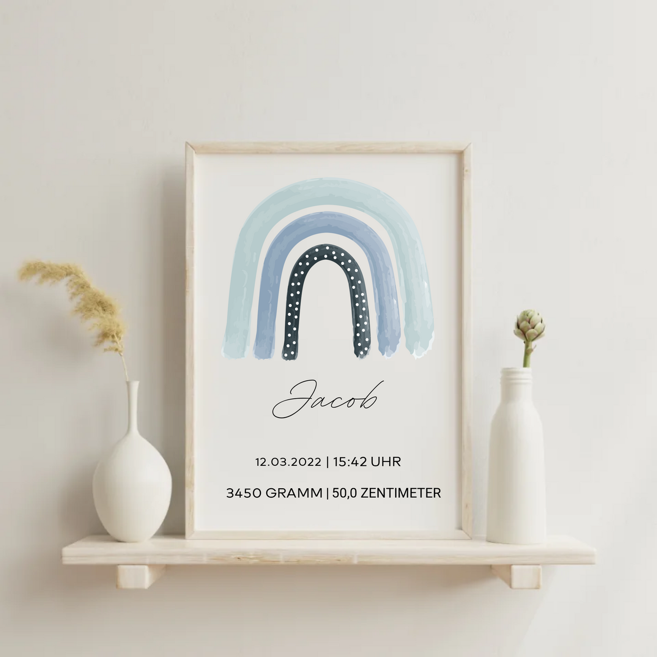 Der sanfte, aquarellartige Regenbogen in zarten Blau- und Grautönen verleiht dem Poster einen zauberhaften, zeitlosen Look. Unter dem Regenbogen findest Du in eleganter Handschrift den Babynamen. Darunter sind Datum, Uhrzeit, Gewicht und Größe klar strukturiert aufgelistet – so behältst Du immer die wichtigsten Zahlen im Blick.